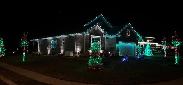 This home in Barnegat Township, NJ is surrounded by their plants/trees blending green and blue lighting creates a rich, layered holiday look that feels both festive and natural. Wrapping these plants/trees and accenting plants throughout the property adds depth and dimension, allowing the entire landscape to glow beautifully from every view.